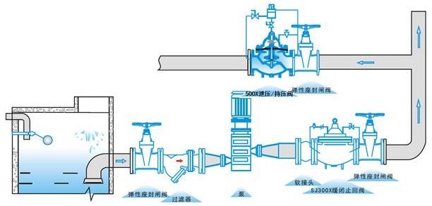 水力控制接管系統。利用水力自動操作,即可以作泄壓閥用又可作持壓閥用。作泄壓閥用時,可維持供水路壓力在設定的安全值之下;做持壓閥用,可維持主閥上游水壓在設定值之上,保持主閥上游供水壓力。