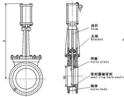PZ673W/F 不銹鋼氣動刀型閘閥:氣動驅動、對夾式連接、明桿平行式剛性單閘板,閥座密封面為硬質合金與聚四氟乙烯,公稱壓力 PN10~16,閥體材料為碳素鋼(PZ673H-10C~16C)、不銹鋼(PZ673F-10P~16P PZ673Y-10P~16P),具有排渣功能的的閘閥。
